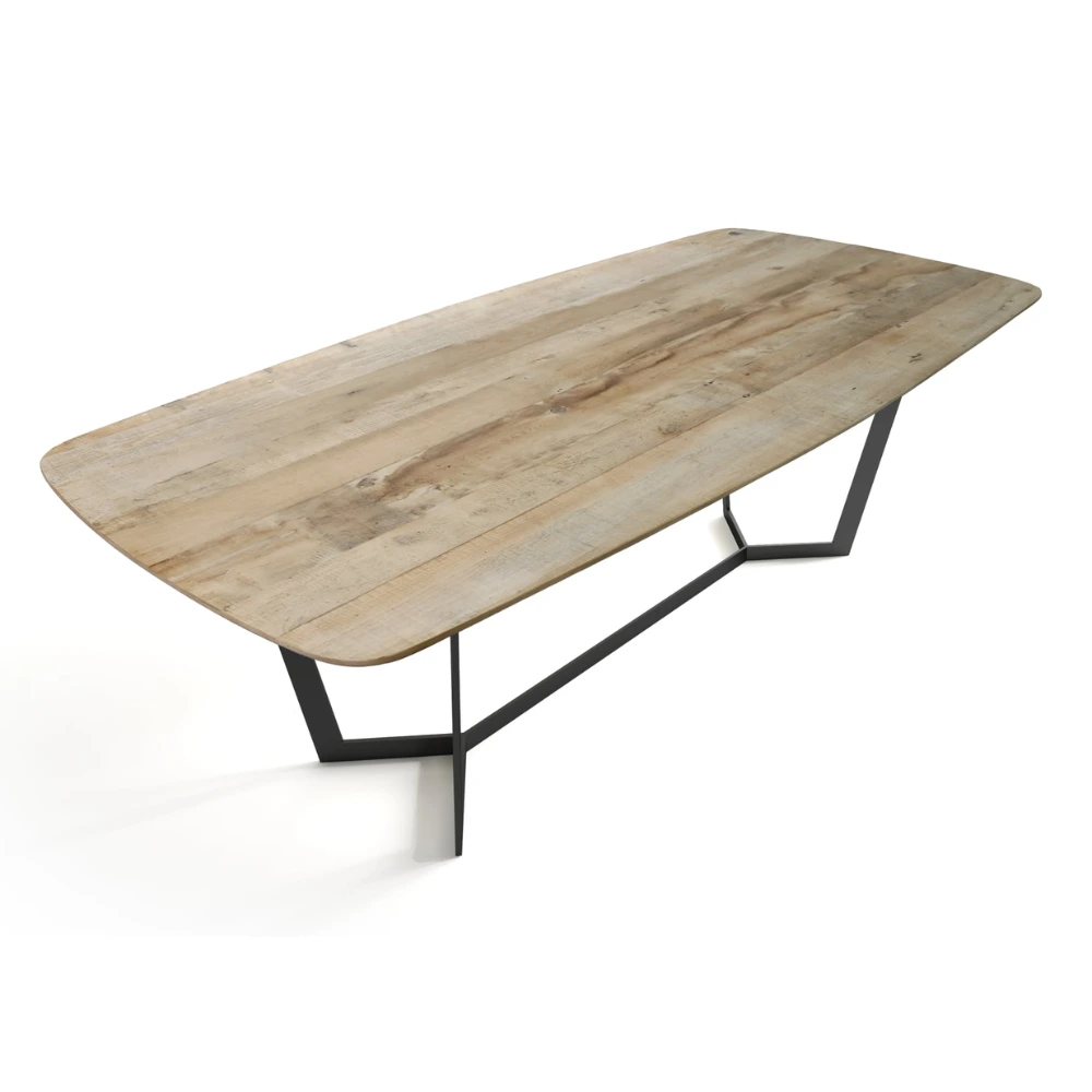 Disponibile in due varianti di dimensioni è progettato per sostenere piani tavolo a partire da 180 x 100 cm fino a 200 x 100 cm. La base centrale e il design lineare lo rendono ideale per ambienti alpini contemporanei, dove il contrasto tra il ferro e il legno di recupero valorizza l’autenticità e la raffinatezza degli interni.