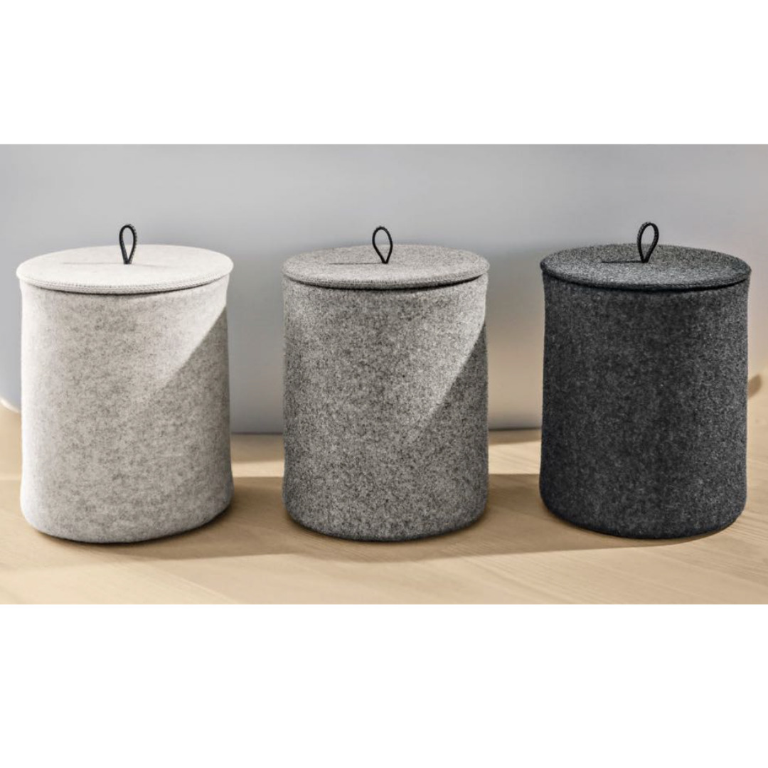 La forma cilindrica e il coperchio rendono la cesta Felt ideale per contenere oggetti di vario tipo, dai giocattoli ai prodotti per la cura personale, dai documenti ai piccoli oggetti di uso quotidiano che si desidera tenere in ordine ma a portata di mano. La facilitร  con cui puรฒ essere spostata e la sua discreta presenza estetica la rendono un complemento d’arredo particolarmente adatto a chi ama gli spazi ordinati ma accoglienti.