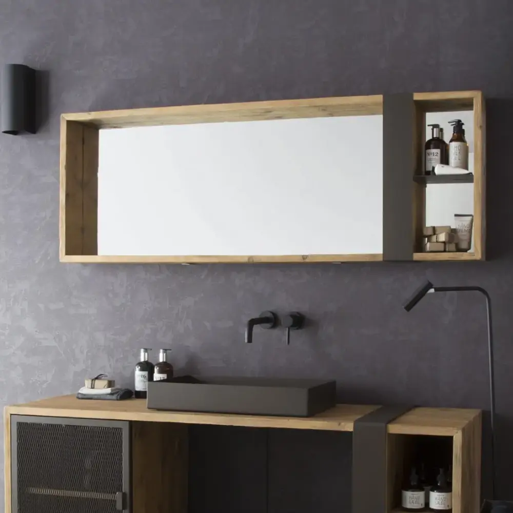 Disponibile in due versioni, questa specchiera si adatta con facilità a diverse esigenze e stili. La prima versione è caratterizzata dalla semplicità di uno specchio racchiuso da una cornice in abete, ideale per chi cerca un pezzo di design pulito e essenziale. La seconda versione aggiunge un tocco di funzionalità e stile: oltre allo specchio, è dotata di una mensola laterale, perfetta per appoggiare oggetti decorativi o di uso quotidiano. Della stessa collezione il mobile da bagno Mod. Industrial.