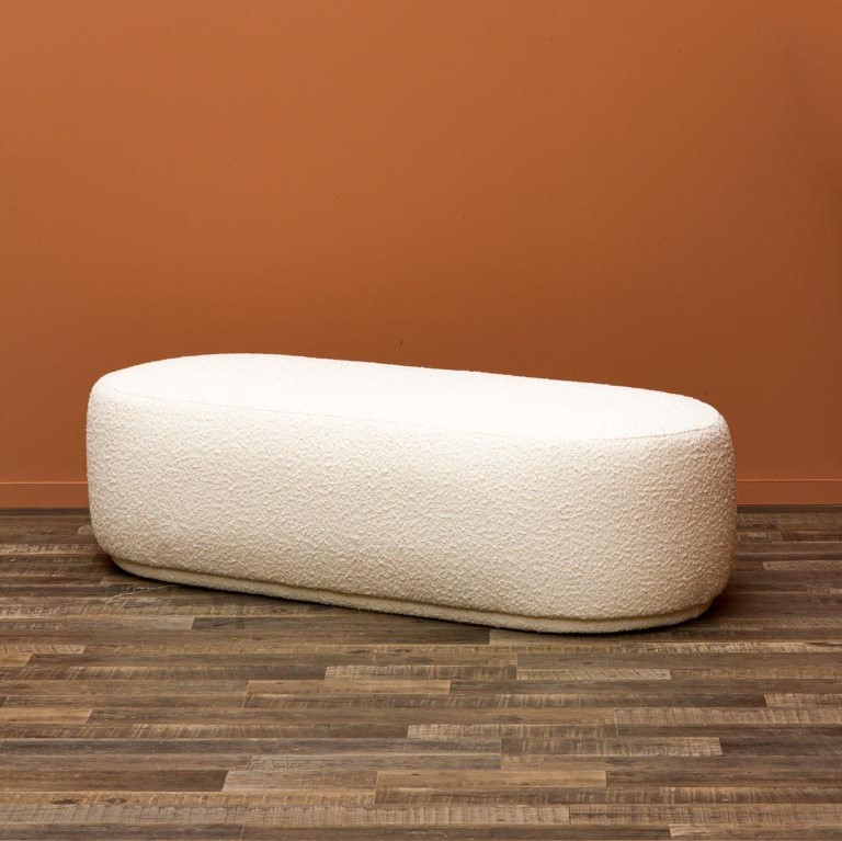 Una panchetta simpatica ed elegante, con struttura in legno di betulla e rivestimento in bouclé bianco.