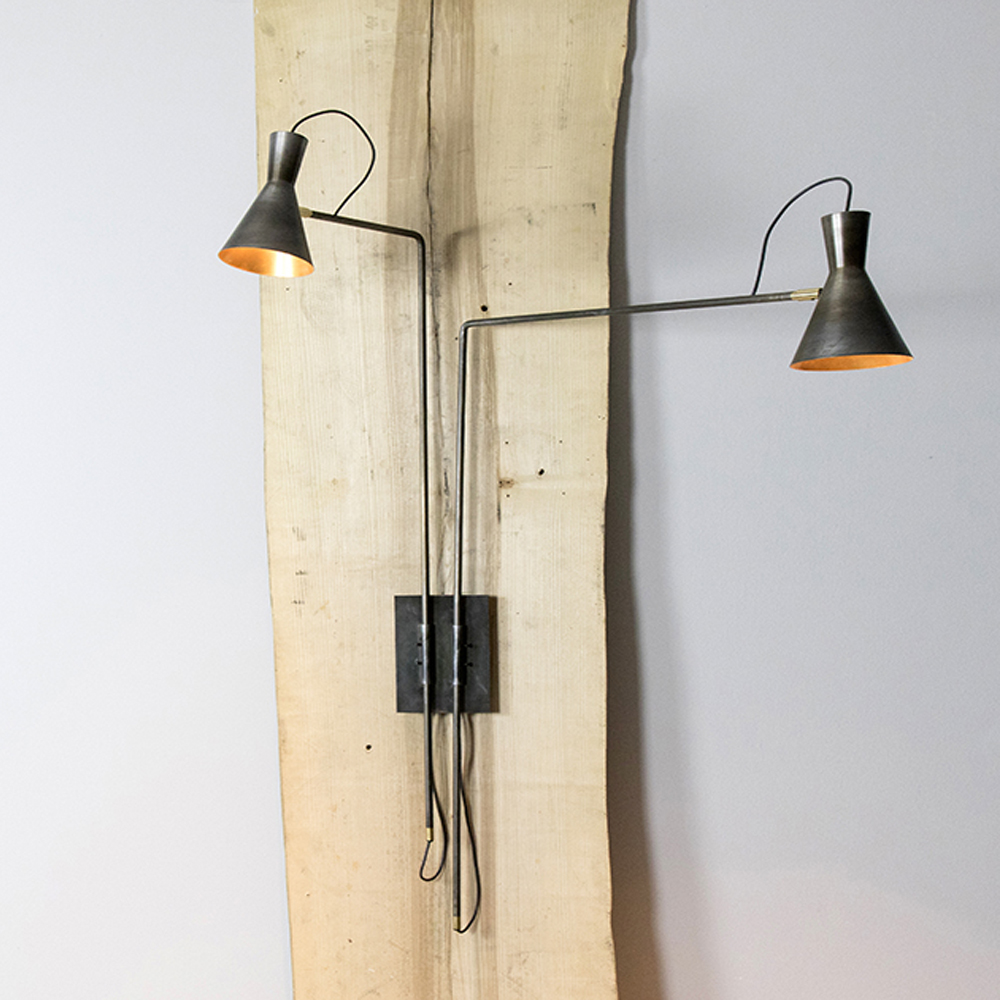 Aggiungi un tocco di eleganza e funzionalità alla tua casa di montagna con la Lampada Mod. Imbuto Doppio. Questa lampada da parete doppia, realizzata in ferro e alluminio con una finitura acidatura chiara e interno oro aranciato, è un vero capolavoro di design.