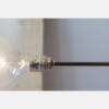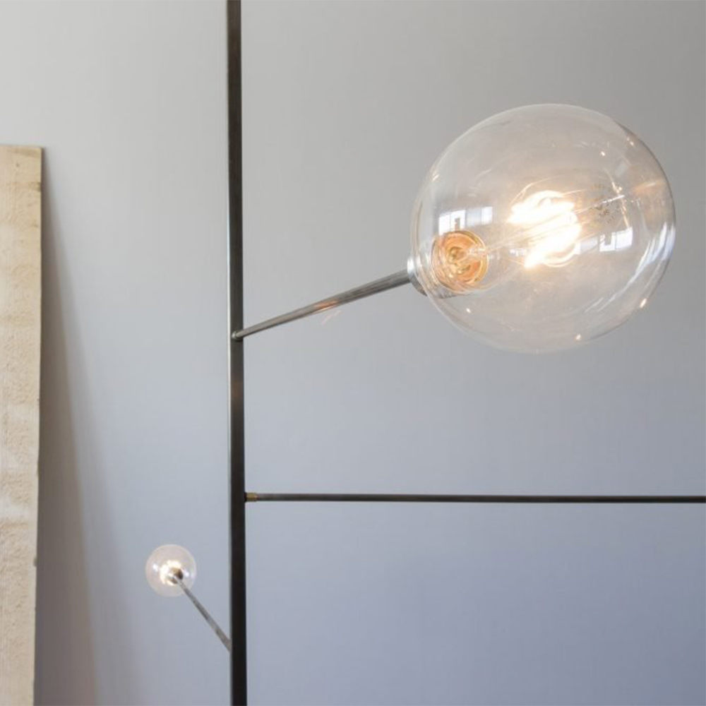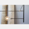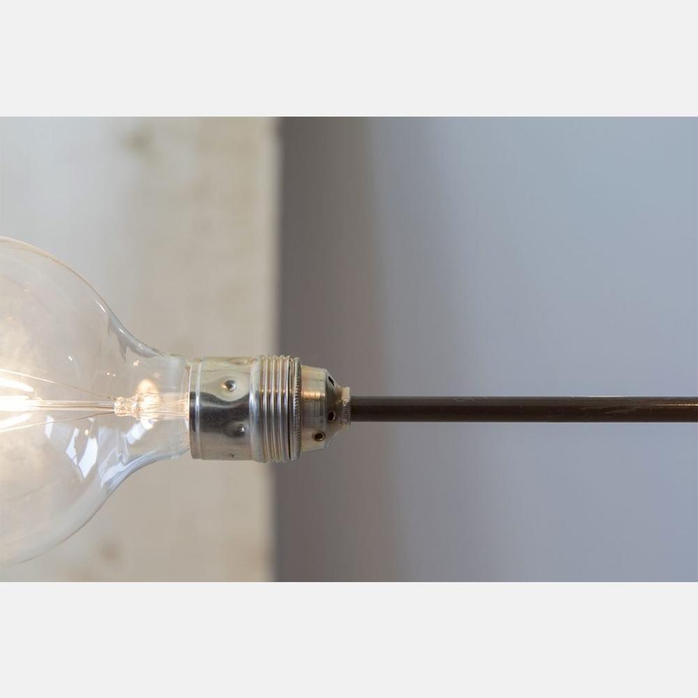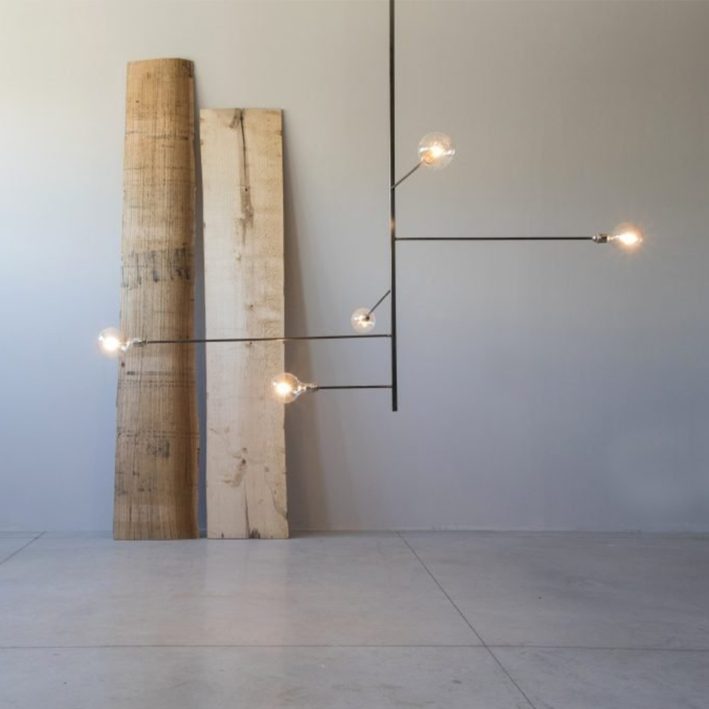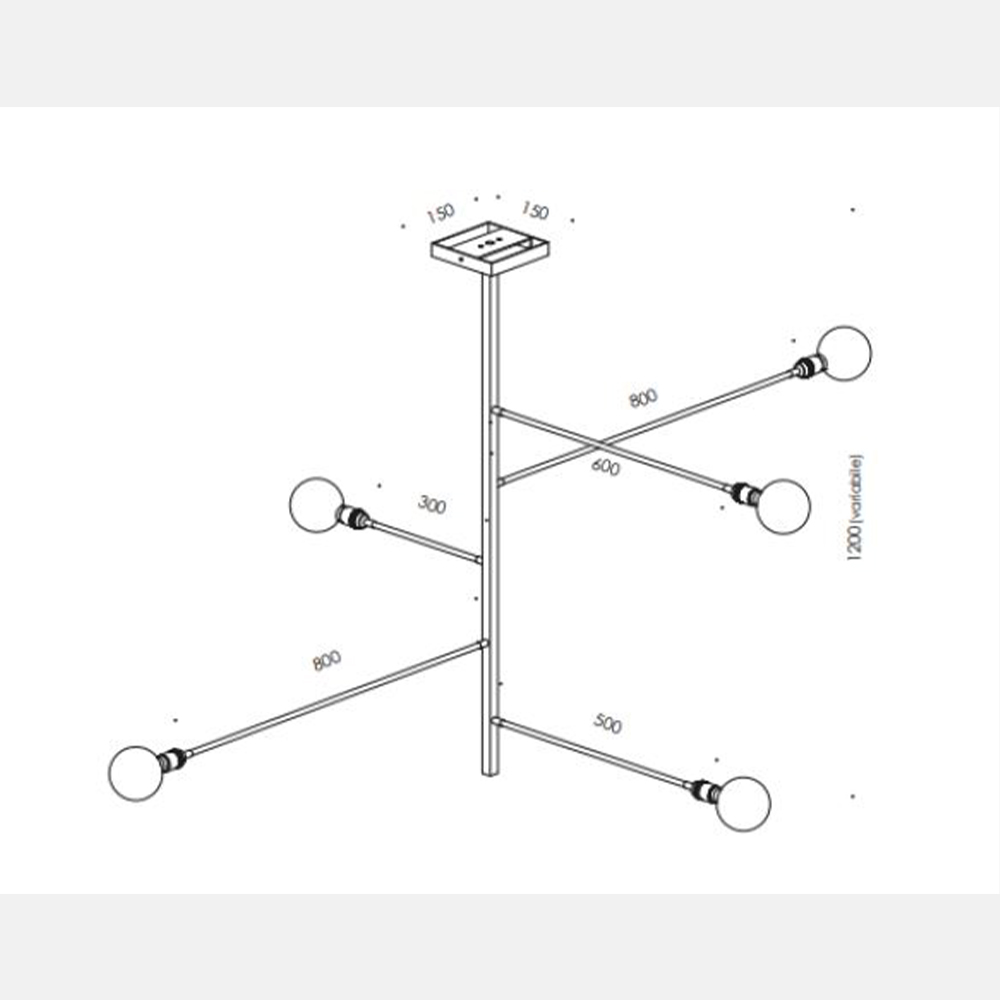 Struttura in ferro con finitura acidata chiara, cinque elementi orizzontali alternati su tutti i lati di varie misure max 80cm, particolari in ottone, base di fissaggio, attacco 5xE27 230V (lamp. escluse).