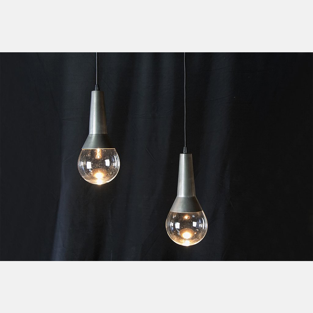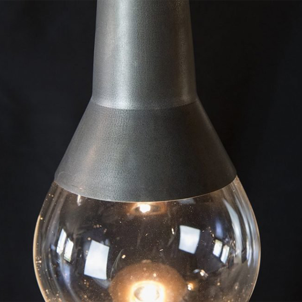 Corpo in alluminio in finitura acidatura scura, cavo di alimentazione tessuto nero, LED 3x2W 500mA 2700K 500Lm, vetro decorativo trasparente, driver incluso in base di fissaggio.