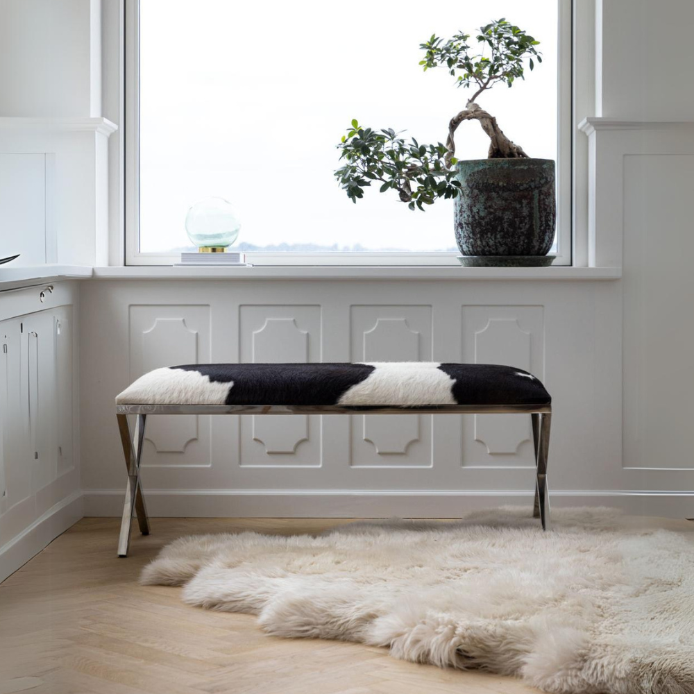 La pelle di mucca è selezionata con cura per garantire il massimo comfort, qualità e lucentezza. Ogni pezzo è unico data la naturalezza della materia prima, il che significa che la pelle che vedrai sulla panca potrebbe variare leggermente rispetto a quella mostrata in foto. Tuttavia, puoi essere certo che ogni pezzo sarà esclusivo e di alta qualità, aggiungendo un tocco di autenticità e originalità al tuo ambiente.