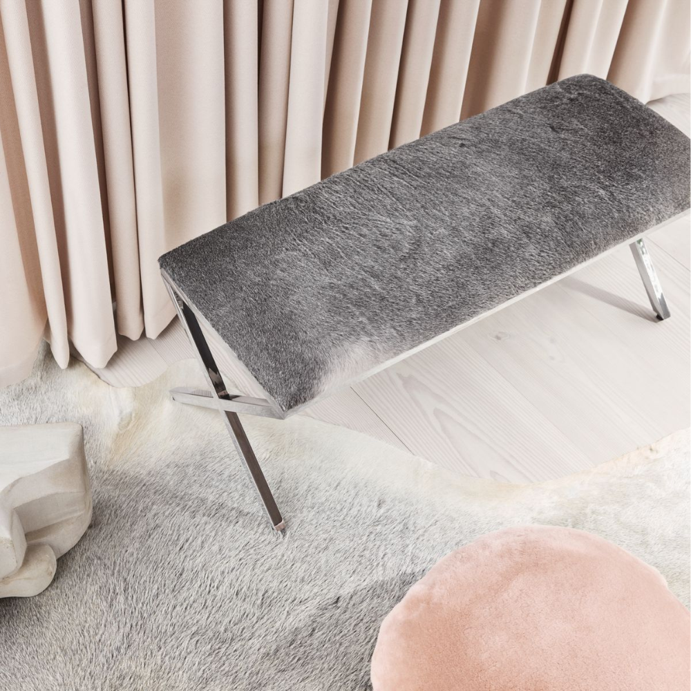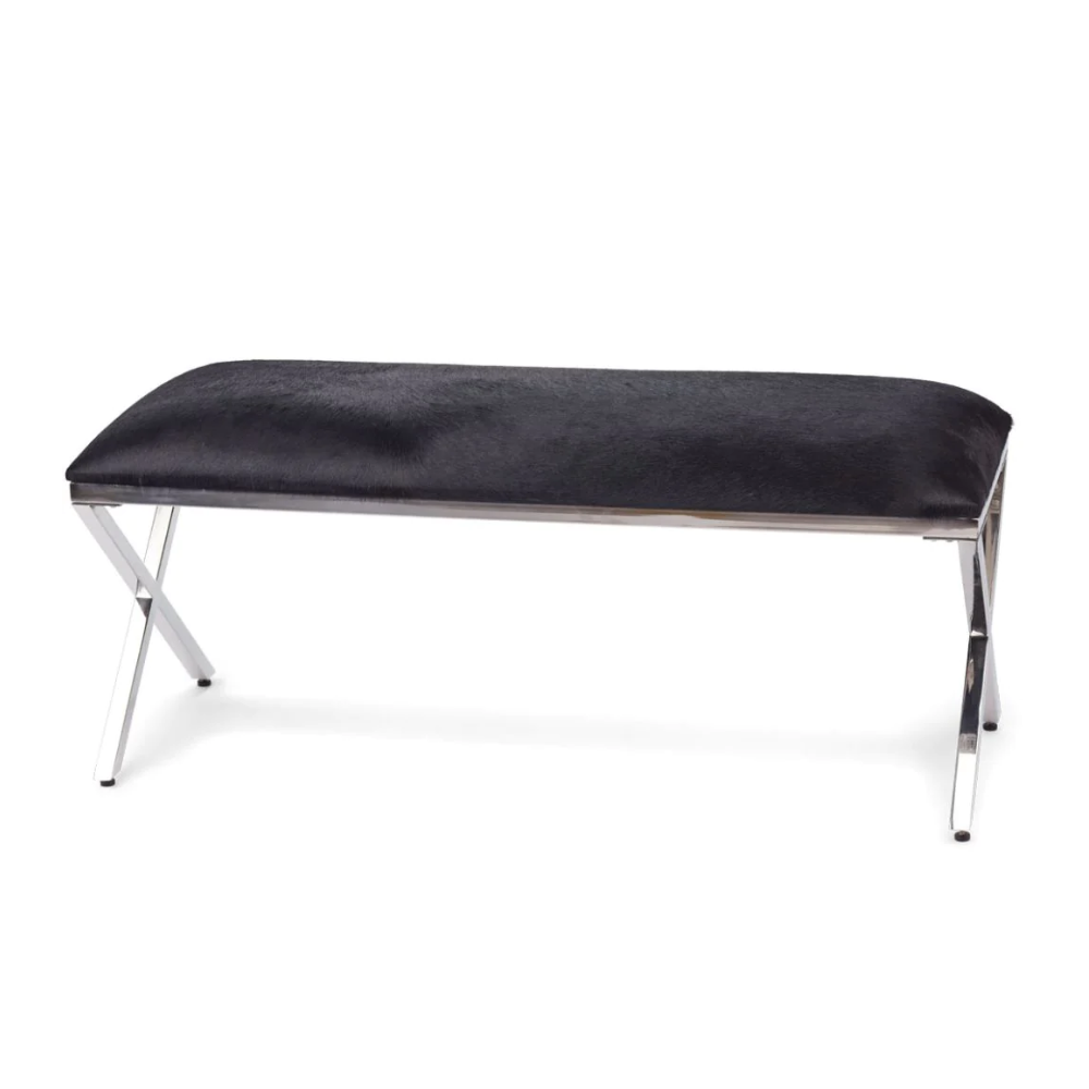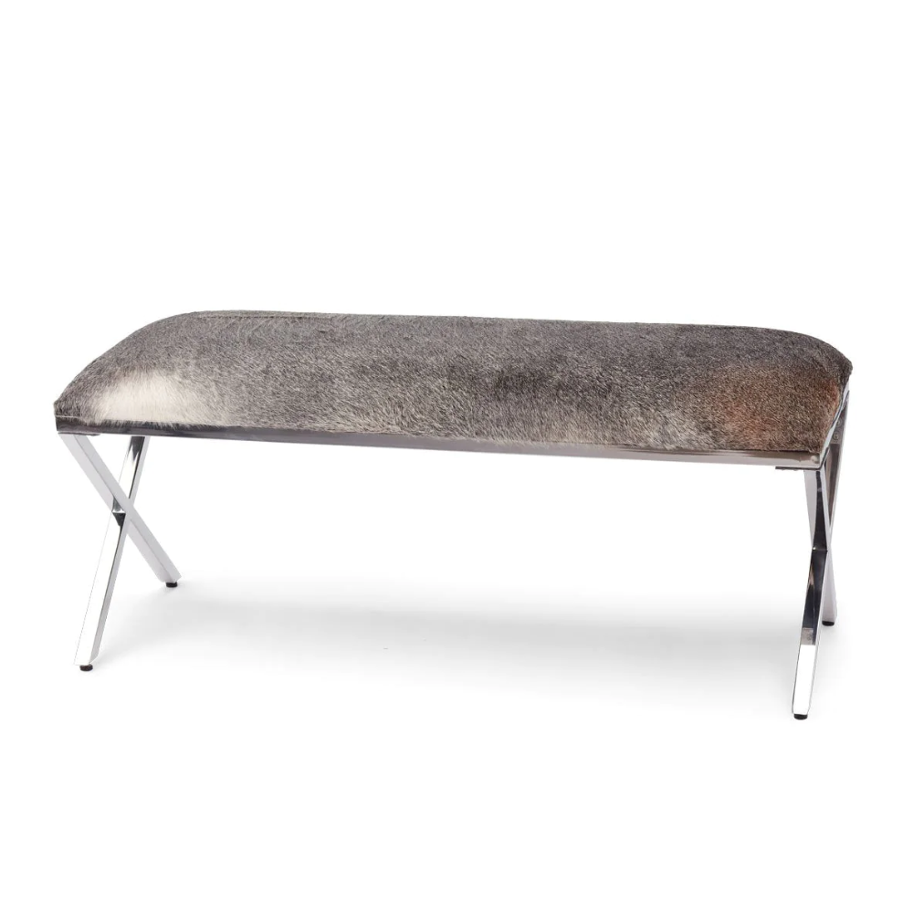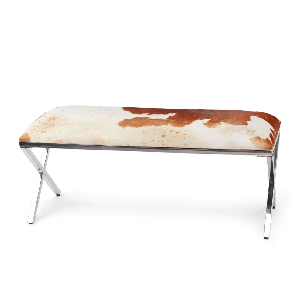 Aggiungi un tocco di rustica eleganza alla tua casa di montagna con la Panca Mod. Cowhide. Realizzata con una combinazione di acciaio inossidabile e pelle di mucca, questa panca rettangolare unisce materiali di alta qualità a un design distintivo e accattivante.