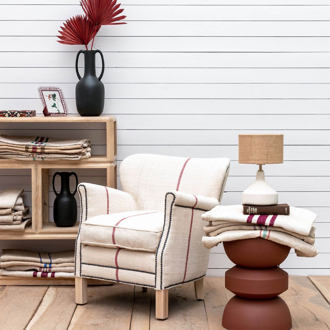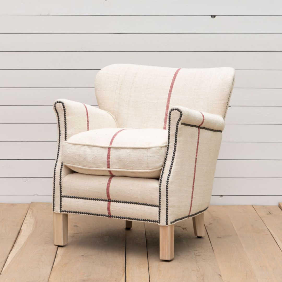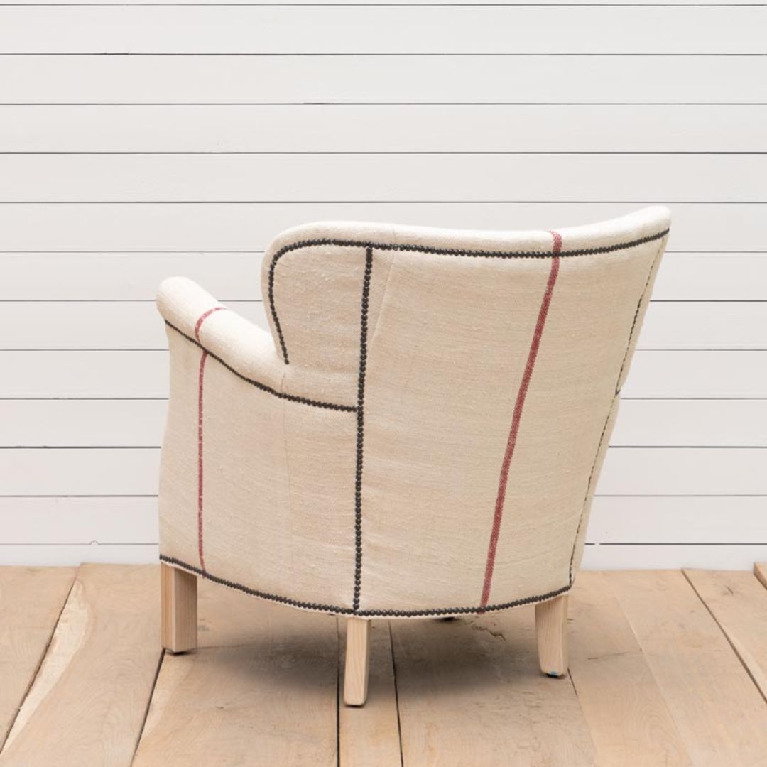 La Poltrona Mod. Sacco di Farina รจ caratterizzata da una fantasia unica che ricorda gli antichi sacchi di farina. Il rivestimento bianco con un motivo a sacco di farina, accentuato dal classico filo rosso al centro, aggiunge un tocco di originalitร e carattere alla tua casa.