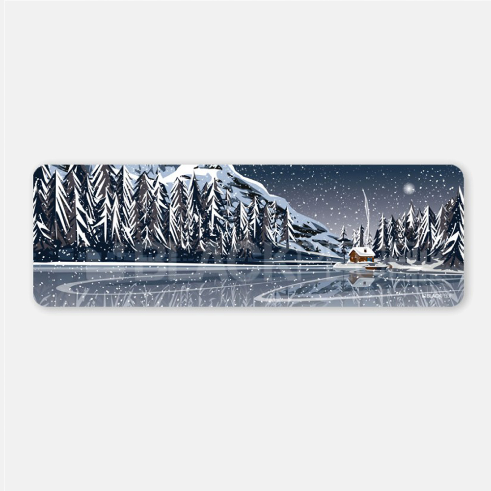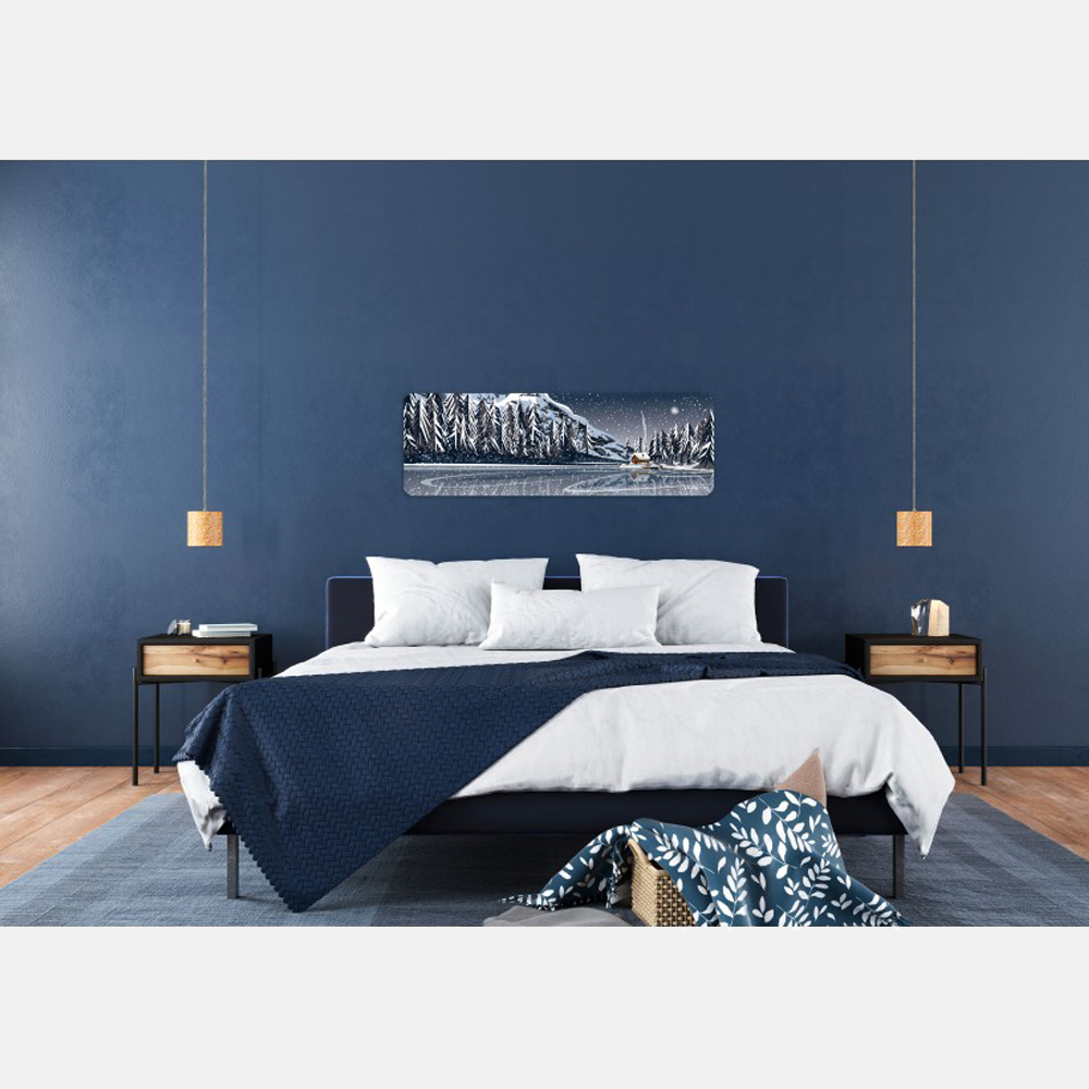 Aggiungi un tocco di avventura al tuo spazio con il quadro Chalet au bord du lac, che raffigura uno chalet sulle rive di un lago ghiacciato. Questo quadro rettangolare con angoli arrotondati è realizzato con inchiostri anti-UV su pannello in Forex, un materiale resistente e leggero.