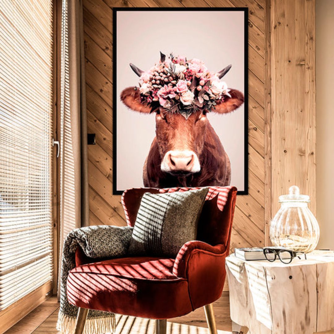 La mucca, simbolo di tenerezza e dolcezza, รจ riprodotta con grande cura dei dettagli e della resa cromatica, creando un’immagine unica e originale. La corona di fiori, invece, aggiunge un tocco di freschezza e vitalitร  al dipinto, rendendolo un’opera d’arte perfetta per qualsiasi ambiente, dal rustico al moderno.