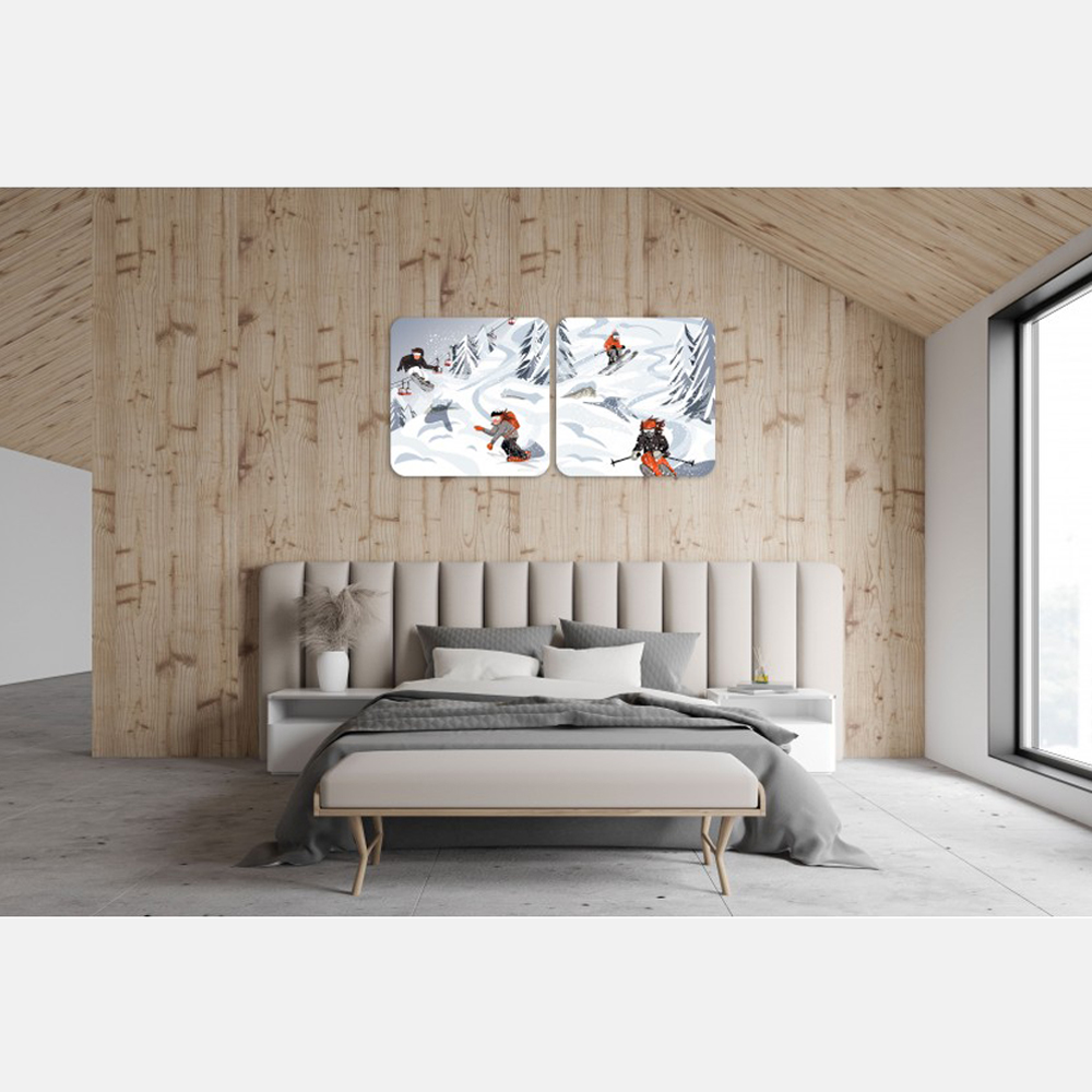 Aggiungi un tocco di avventura al tuo spazio con i quadro Pack combo rider, che raffigura degli snowboarder da un lato e degli sciatori dall’altro. Questo quadro quadrato con angoli arrotondati è realizzato con inchiostri anti-UV su pannello in Forex, un materiale resistente e leggero.