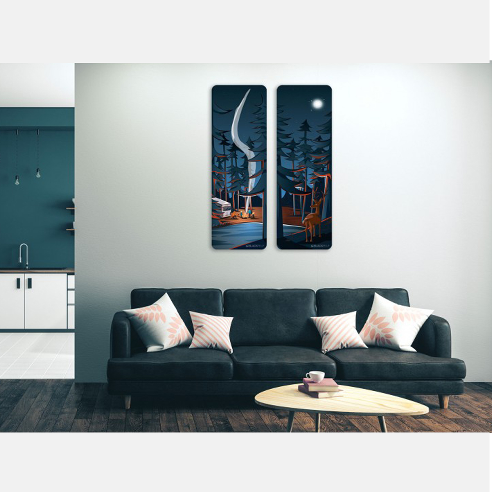 Aggiungi un tocco di avventura al tuo spazio con il Quadro Vertical Cerf, che raffigura un cervo intento ad osservare dei campeggiatori. Questo quadro rettangolare con angoli arrotondati รจ realizzato con inchiostri anti-UV su pannello in Forex, un materiale resistente e leggero.