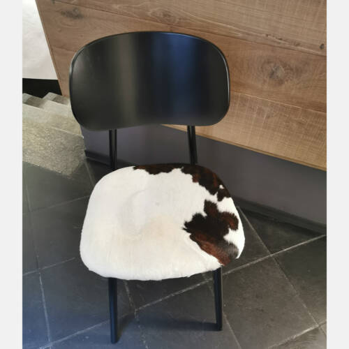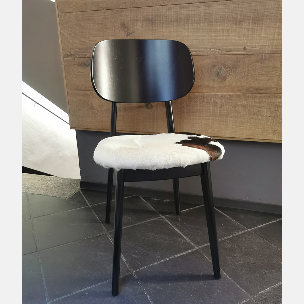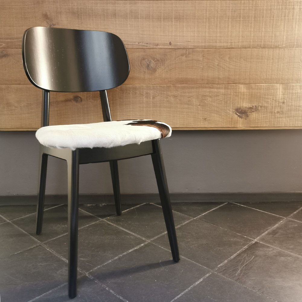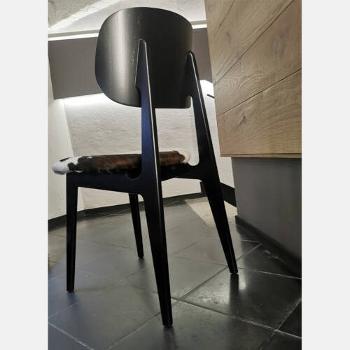 La sedia in faggio verniciato nero con seduta di pelle di mucca รจ un esemplare di design che combina l’eleganza contemporanea con il calore e l’autenticitร dei materiali naturali. Questo pezzo di arredo unico si distingue per la sua capacitร di armonizzare due elementi di grande carattere: il legno di faggio, noto per la sua resistenza e bellezza, e la pelle di mucca, che aggiunge un tocco di naturalezza e comfort.