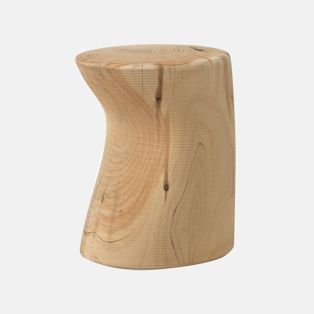 Sgabello in legno massello di cedro profumato lavorato da un blocco unico, caratterizzato da uno scanso laterale. E’ completamente naturale e rifinito a mano senza l’aggiunta di alcun trattamento.