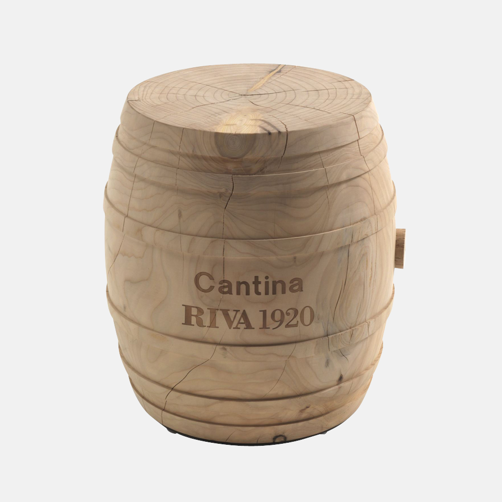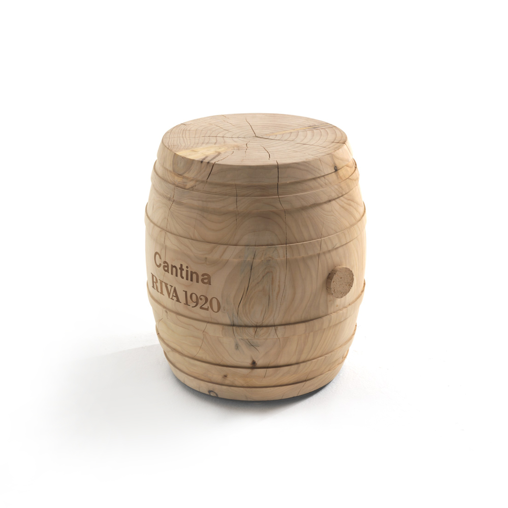 Sgabello in legno massello di cedro profumato lavorato da un blocco unico, che si ispira alla forma di una botte a doghe cerchiate. E’ completamente naturale e rifinito a mano senza l’aggiunta di alcun trattamento.